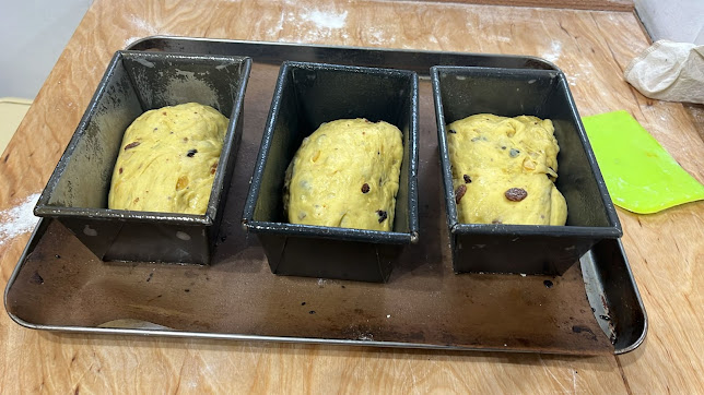 Prepare three 1lb loaf tins or a 2lb loaf tin and a 1lb loaf tin....or something that will accommodate roughly 1100 gms dough.